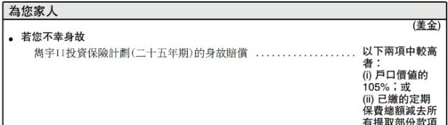 6、被投保身故,可获帐户价值105%的身故赔偿。如果在最短供款期内意外身故,另外可以获得30万到100万元港币的意外身故赔偿。