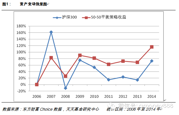 4)这里我随意截取沪深300指数,2006年至2014年的数据做例举(假设初始投资10万元,买入沪深300指数基金与货币基金各5万元,默认货币基金部分年收益率4%).