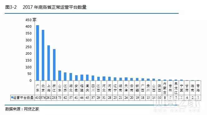 截至2017年底,正常运营平台数量排名前三位的是广东、北京、上海,数量分别为410家、376家、261家,浙江紧随其后,正常运营平台数量为233家,四地占全国总平台数量的66.29%,表明我国网络借贷行业平台地区集中度相对较高,这与网络借贷行业的金融属性、地区政策支持力度都紧密相关。