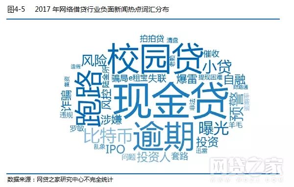 2017年网络借贷行业的负面新闻焦点词汇主要分为以下几类:从产品业务类型上,主要是校园贷、现金贷、比特币等;从行业本身而言,主要是跑路、逾期、曝光、诈骗等,此类词汇或事件负面指数较高,讨论热度也较高。