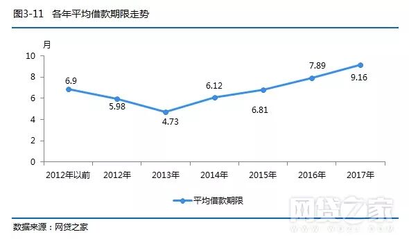 2017年网络借贷行业平均借款期限为9.16个月,相比2016年拉长了1.27个月。从2017年各月的平均借款期限走势看,虽然有波动,但整体趋势向上,其中12月份的平均借款期限高达10.02个月。主要是由于部分平台成交体量大,长期限项目标的数量越来越多,从而带动行业平均借款期限拉长。预计2018年全年网络借贷行业平均借款期限或将在10个月附近。