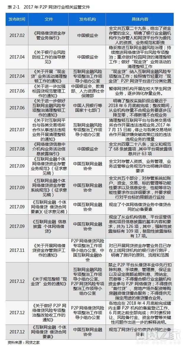 2017年12月8日,P2P网络借贷风险专项整治工作领导小组办公室下发《关于做好P2P网络借贷风险专项整治整改验收工作的通知》,通知要求,各地应在2018年4月底前完成辖内主要P2P机构的备案登记工作、6月底之前全部完成;并对债权转让、风险备付金、资金存管等关键性问题作出进一步的解释说明。