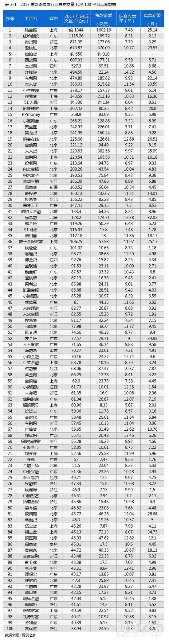 以网贷之家监测的所有网贷平台为对象,分别对平台的成交量作数据降序处理,展示了2017年成交量TOP100平台,如下表所示。