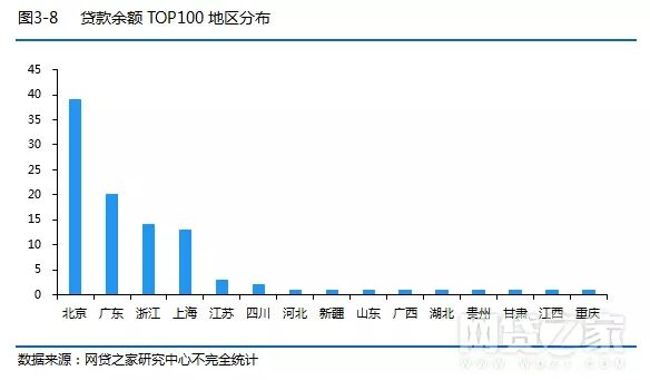 贷款余额TOP100平台地区分布集中度较高,八成以上分布在北上广浙四个地区,地域优势显著。如下图所示,TOP100中北京地区平台数量最多,有39家;其次是广东20家;浙江和上海分别有14家和13家。
