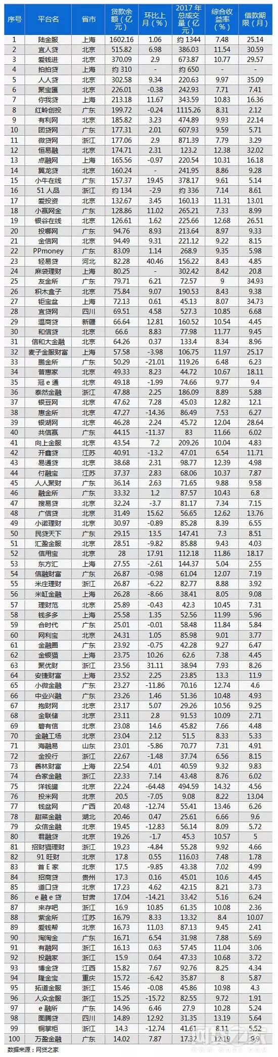 以网贷之家监测的所有网贷平台为对象,分别对平台的贷款余额作数据降序处理,展示了2017年贷款余额TOP100平台,如下表所示。