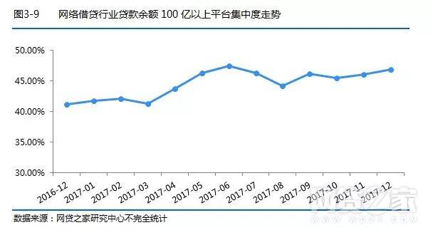 下图展示的是网贷平台贷款余额在100亿及以上平台占行业贷款余额的比例走势,2017年是网络借贷行业监管合规年,良币驱逐劣币,虽然2017年行业集中度一直处于振荡状态,但从5月开始,百亿贷款余额平台的行业集中度大都在45%以上,且最近3个月,有持续走高的趋势。
